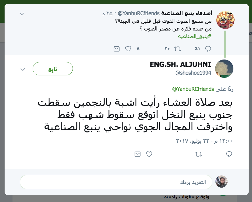 Return to "بالصور.. سعوديون يؤكدون سقوط صاروخ باليستي يمني على مصافي النفط في محافظة ينبع"