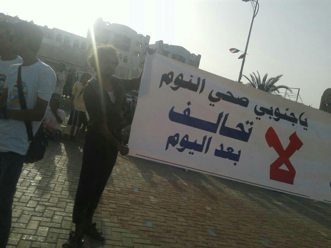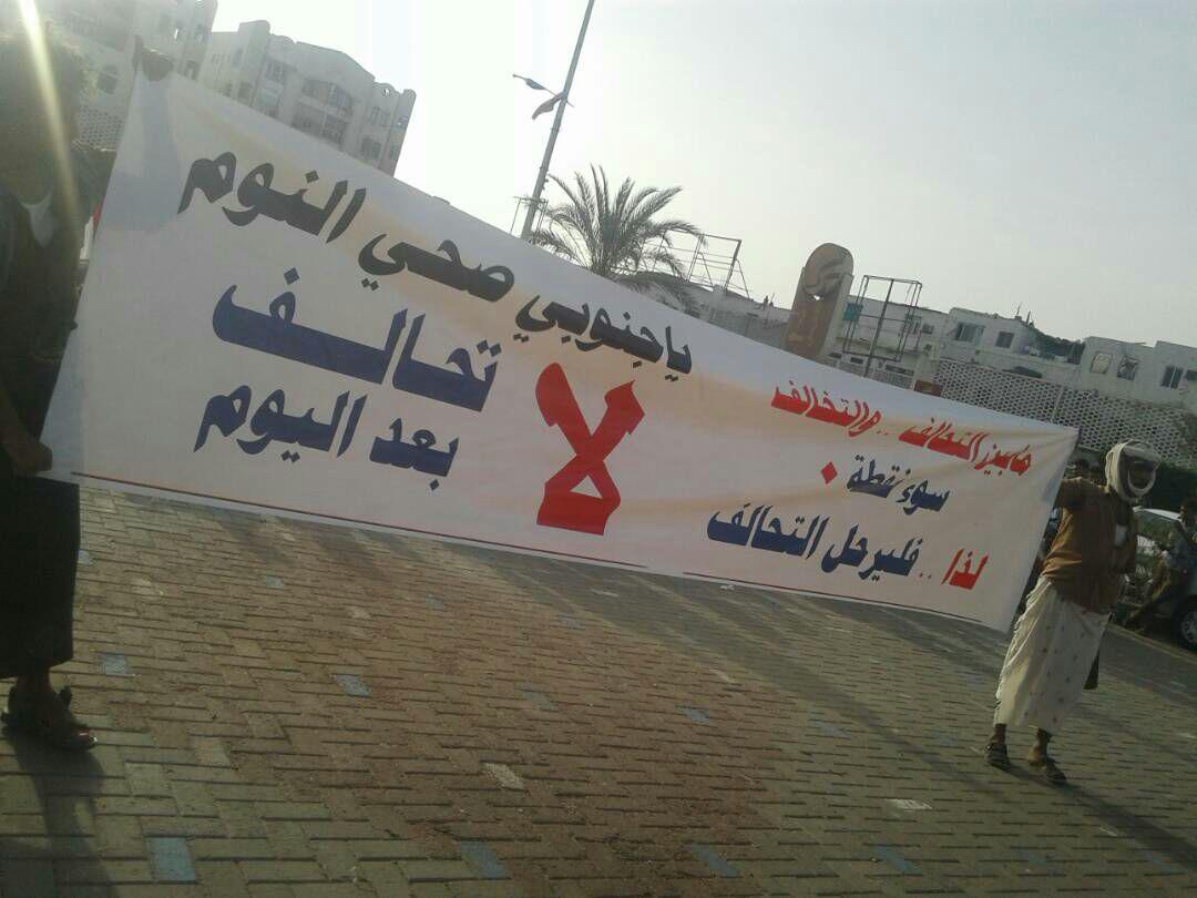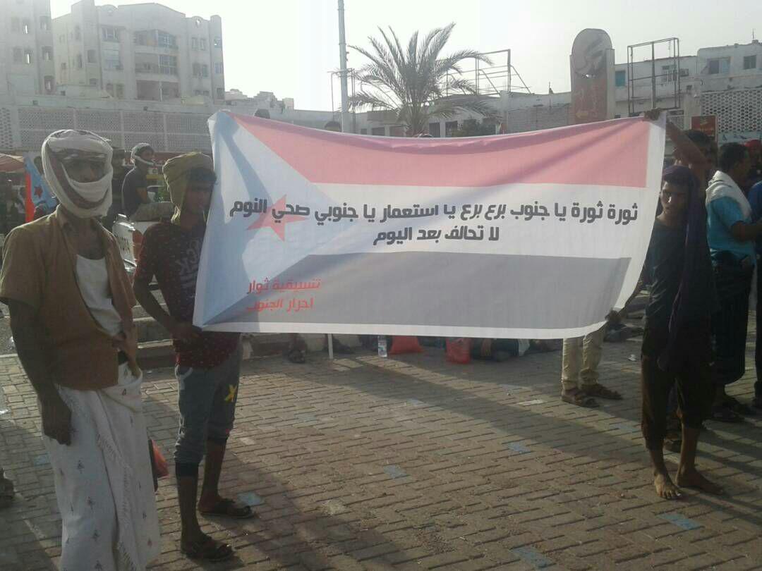 وخلال الإحتفالية التي أقيمت في ساحة العروض بخور مكسر بمشاركة جماهيرية واسعة رفع المشاركون في الفعالية لافتات وشعارات كبرى ضد الاحتلال السعودي الإماراتي الجديدة الجاثم على المحافظات الجنوبية,منها ” ياجنوبي صح النوم لا تحالف بعد اليوم”و”ثورة ثورة يا جنوب..برع برع يا استعمار”.