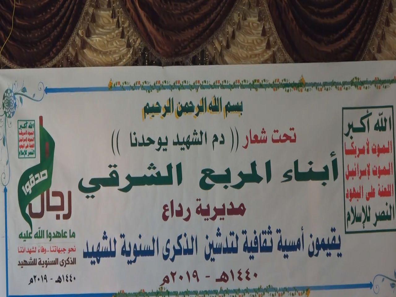 أقام أبناء المربع الشرقي بمديرية رداع بمحافظة البيضاء اليوم أمسية ثقافية بمناسبة الذكرى السنوية للشهيد وبحضور رسمي ومجتمعي عكست مدى استشعار المجتمع لعظمة الشهداء ولأهمية استذكارهم وعبرت عن الارتباط الوثيق بين الشهداء وابناء المجتمع .