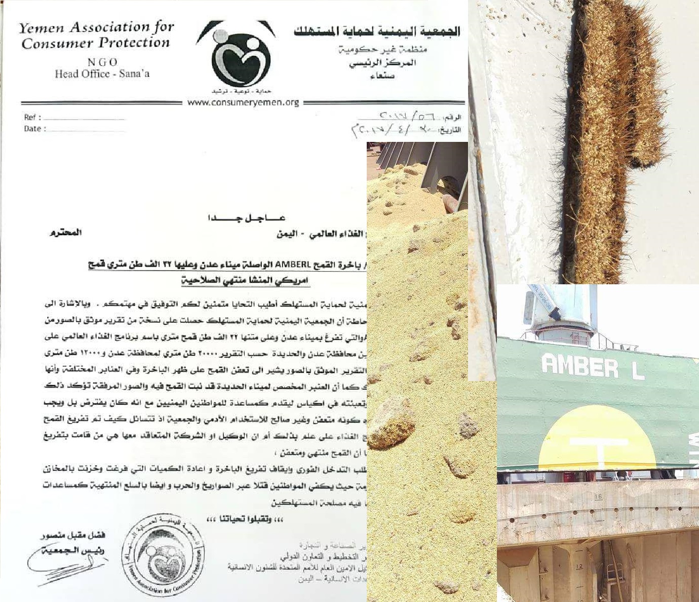 ولفتت الجمعية في مذكرتها إلى أن الباخرة التي وصلت ميناء عدن، كانت تحمل شحنة من 32 ألف طن من القمح الأمريكي المنشأ منتهي الصلاحية، وتابع لبرنامج الغذاء العالمي”.