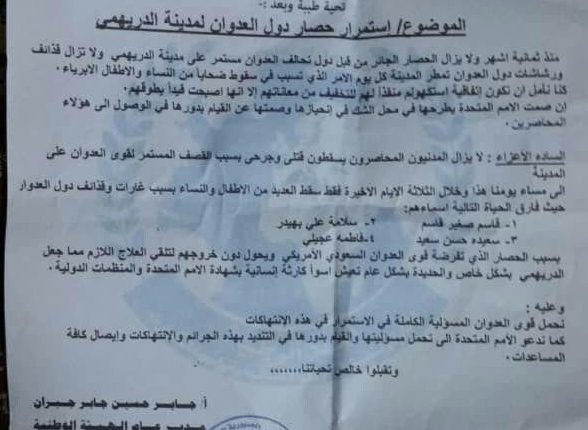 ودعت الهيئة الوطنية الأمم المتحدة إلى تحمل مسؤوليتها والقيام بدورها في التنديد بالجرائم والانتهاكات في الدريهمي وإيصال كافة المساعدات.