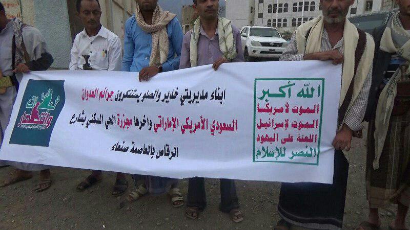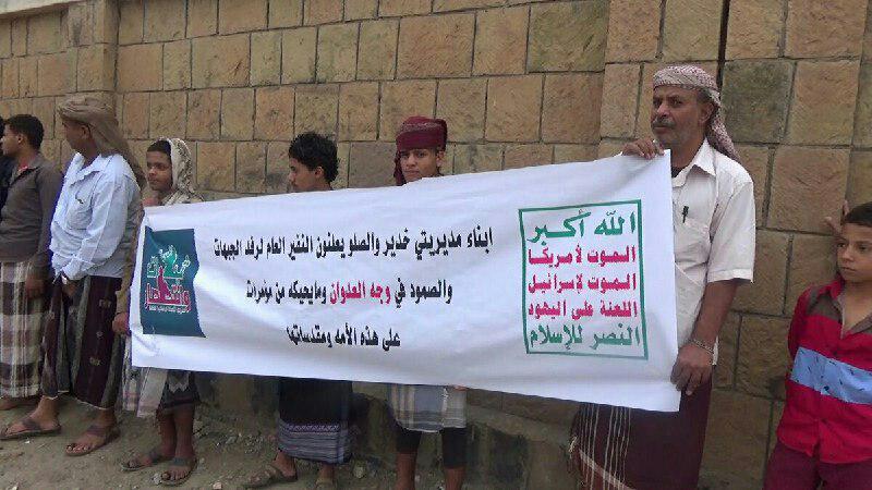 وفي سياق متصل نظمت وقفة عصر يوم الخميس في عزلة السلمي ندد المشاركون فيها بالمجازر التي يرتكبها قوى الشر وعلى راسهم أمريكا وإسرائيل بحق الشعب اليمني والتي كانت أخرها جريمة شارع الرقاص بالعاصمة صنعاء والتي راح ضحيتها العشرات من الشهداء والجرحى.