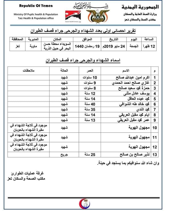 ونشرت غرفة عمليات الطوارئ التابعة لمكتب الصحة بتعز قائمة بأسماء الشهداء الذين سقطوا جراء جريمة العدوان بمديرية ماوية، ضمت 12 شهيد معظمهم أطفال بالإضافة الى جريح واحد.