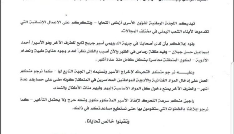 وتظهر رسالة بعثت بها اللجنة الوطنية لشئون الاسرى الى بعثة الصليب الاحمر في صنعاء في ال8 من مايو المنصرم ،تطلب فيها من الصليب الأحمر التفاوض مع قوى العدوان لاخراج الأسير من مدينة الدريهمي المحاصرة من قبل قوى العدوان وتسليمه للفصيل المسلح الذي يتبعه ، لافتقاد القدرة على علاجه في مدينة الدريهمي المحاصرة ، وابداء التعاون الكامل لإنقاذ حياته.