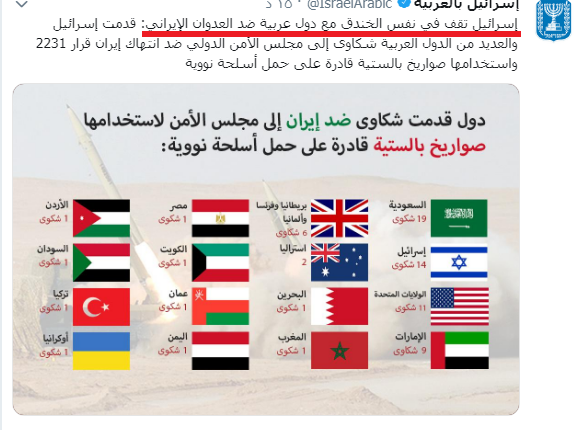 وجاء في تغريدة “إسرائيل بالعربية” أن “إسرائيل تقف في نفس الخندق مع دول عربية ضد العدوان الإيراني: قدمت إسرائيل والعديد من الدول العربية شكاوى إلى مجلس الأمن الدولي ضد انتهاك إيران قرار 2231 واستخدامها صواريخ بالستية قادرة على حمل أسلحة نووية”.