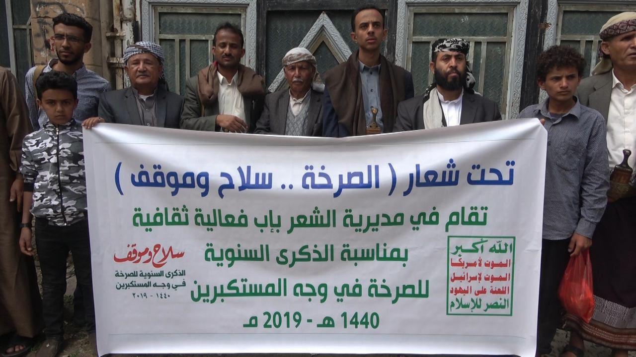 وأوضح بيان الوقفة التي حضرها مدير عام المديرية خليل أبو هاجرة ومدير الإرشاد بمكتب أوقاف المحافظة محمد مرشد أن سلاح الصرخة رغم بساطته إلا أنه قوي جدا في تأثيره على الأعداء وهو حربا نفسية تضرب معنوياتهم ومعيشتهم . داعين إلى التمسك بهذا الشعار الذي اطلقه الشهيد القائد حسين بدر الدين الحوثي في مثل هذه الأيام من العام ٢٠٠٢ م لتحصين الأمة من السقوط في مستنقع العمالة لأعدائها . مشددين على أهمية الحرص على المقاطعة الأمريكية والإسرائيلية فرصة لتنمية الإنتاج المحلي.