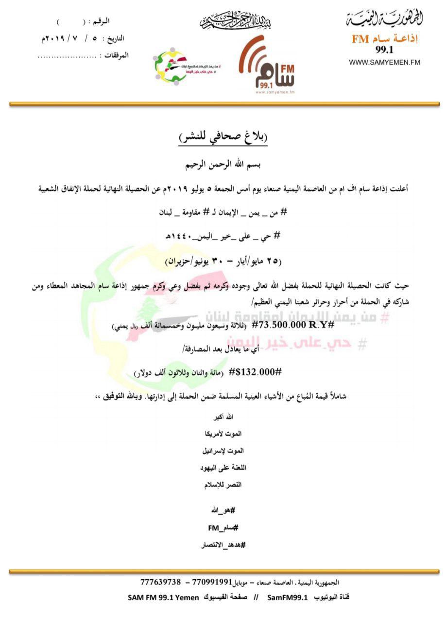 يذكر أن المرحلة الثالثة من حملة الإنفاق الشعبية “حي على خير اليمن” التي أطلقتها إذاعة سام خصصت لدعم المقاومة الإسلامية في لبنان.
