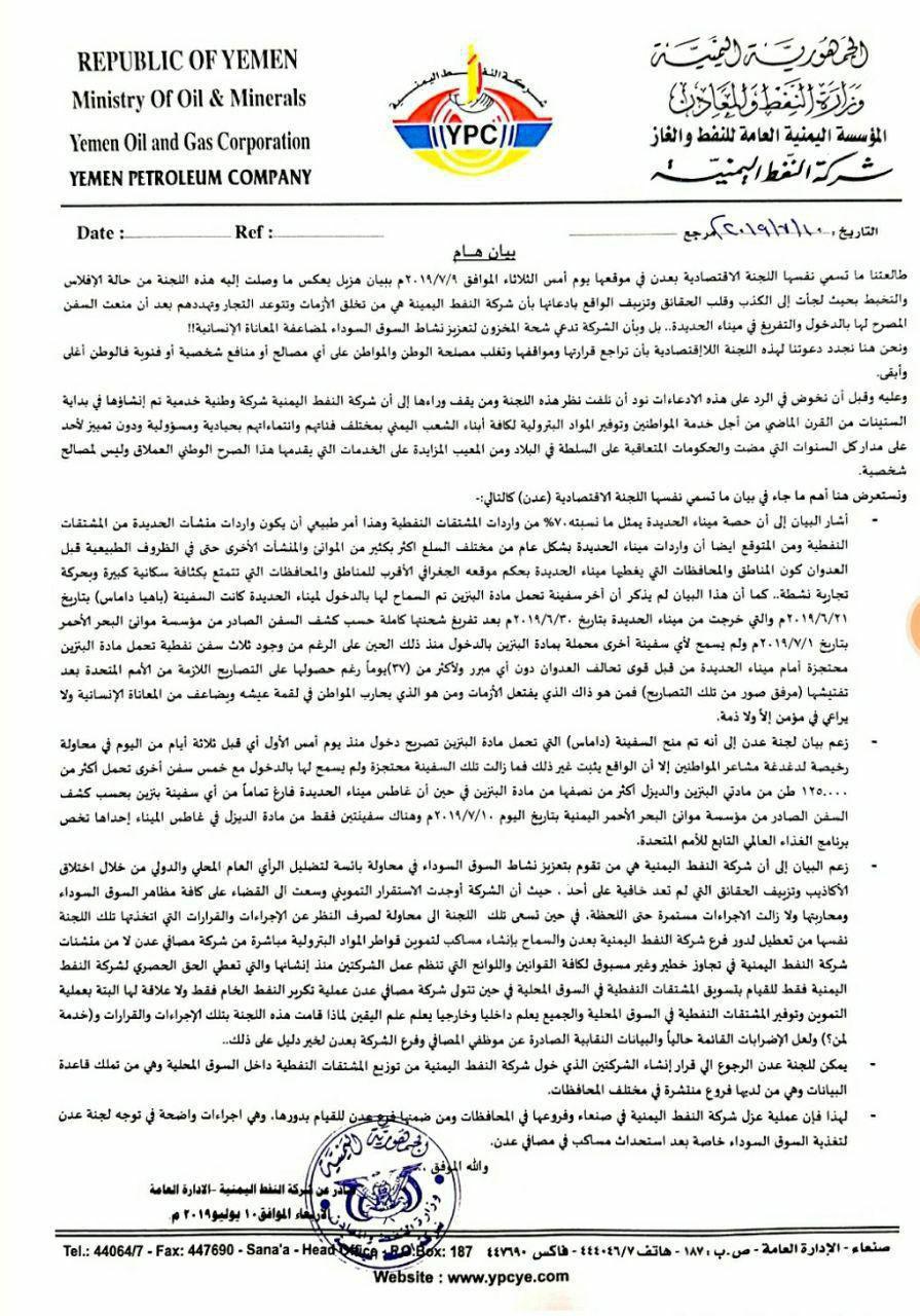 وأوضح البيان: طالعتنا ما تسمى نفسها باللجنة الاقتصادية بعدن في موقعها يوم الثلاثاء المواقف 9/7/2019م ببيان هزيل يعكس ما وصلت إليه هذه اللجنة من حالة الإفلاس والتخبط بحت لجأت إلى الكذب وقلب الحقائق وتزييف الواقع بادعائها بأن شركة النفط اليمنية هي من تخلف الأزمات ووتتوعد التجار وتهددهم بعد أن منعت السفن المصرح لها بالدخول والتفريغ في ميناء الحديدة, بل وبأن الشركة تدعي شحنة المخزون لتعزيز نشاط السوق السوداء لمضاعفة المعاناة الإنسانية.