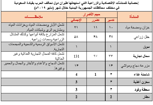 – استمرار استهداف وإغلاق المطارات والموانئ اليمنية من قبل تحالف الحرب على اليمن بقيادة السعودية أدى إلى خسائر اقتصادية كبيرة ، حيث بلغت الخسائر التقديرية على قطاع الطيران المدني والأرصاد بحوالي مبلغ ثلاث مليار دولار.