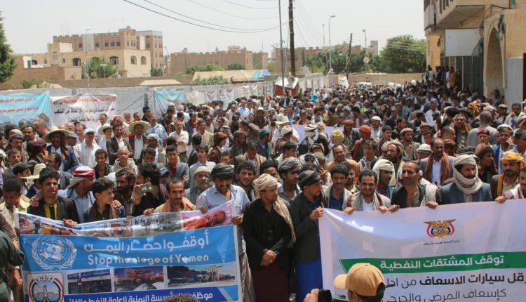 احتجاجات كبرى لشركة النفط ووزارتي الصحة والاتصالات أمام مكتب الأمم المتحدة بصنعاء