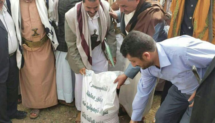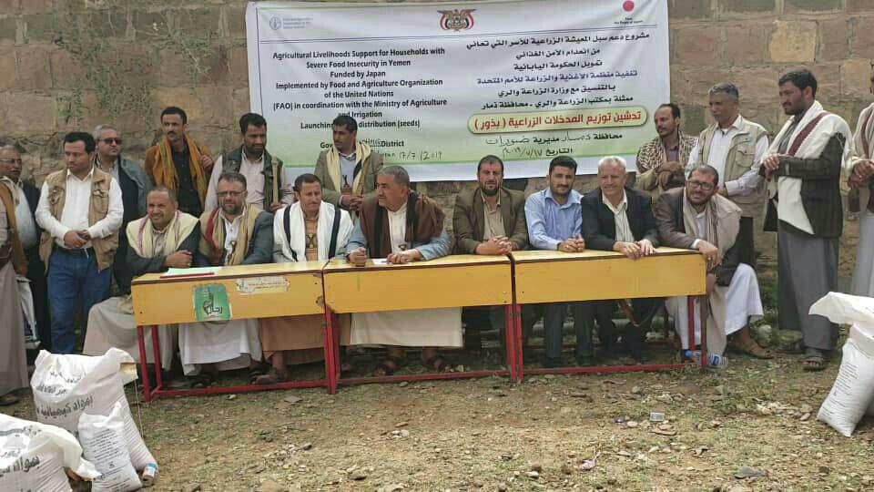 دشن أمين عام المجلس المحلي بمحافظة ذمار مجاهد شايف العنسي ومعه وكيل أول المحافظة فهد المروني اليوم توزيع بذور الحبوب والبقوليات للمزارعين في مديرية ضوران ضمن مشروع دعم سبل المعيشة الزراعية للأسر التي تعاني من إنعدام الأمن الغذائي ؛