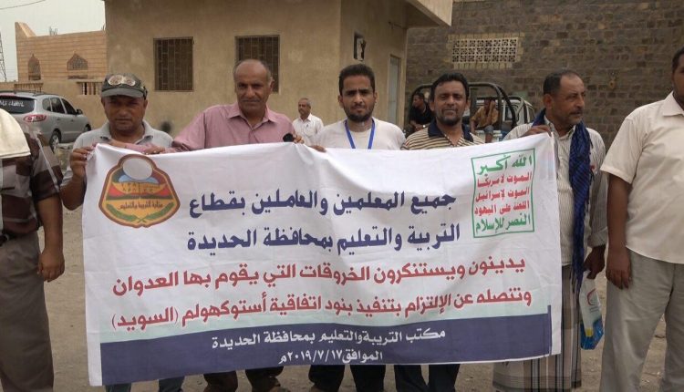وقفة إحتجاجية لتربويي الحديدة للتنديد بخروقات العدوان وتنصله عن تنفيذ إتفاق السويد (صور)