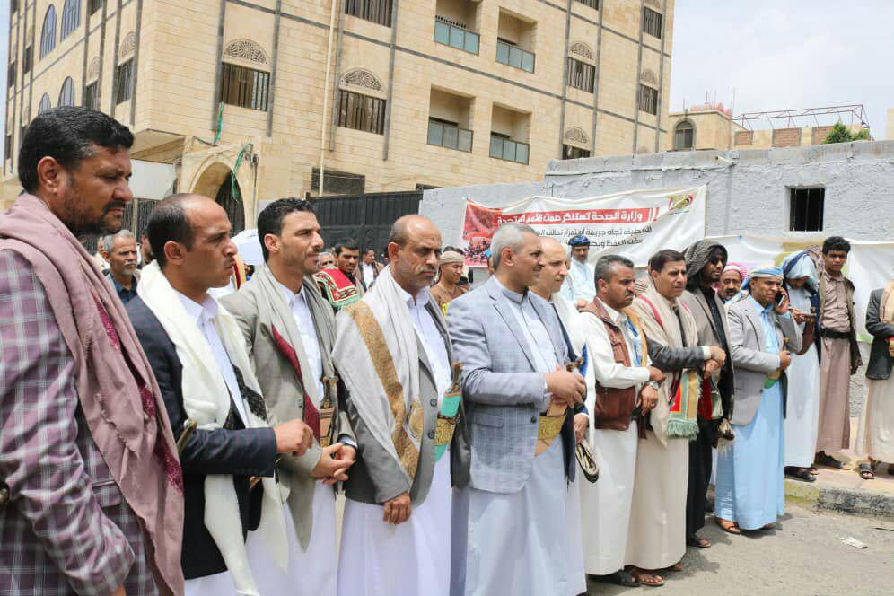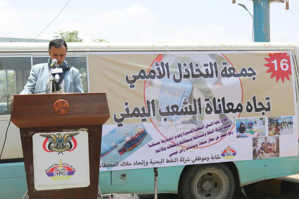 وخلال الوقفة أكد الناطق الرسمي لشركة النفط اليمنية أمين الشباطي ان تحالف العدوان أحتجز سفينة نفطية أخرى أضافة الى عشرات السفن التي تم احتجازها مسبقاً.