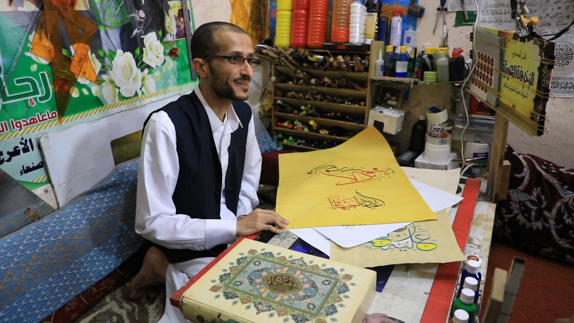 رغم العدوان والحصار إلا أن للفن أبوابا يفتحها مبدعون يمنيون استطاعوا تخطي كل العوائق وأثبتوا حضورهم في الواقع الفني خطاط القرآن الكريم علي يحيى الأعرج كتب مصحفين بروايتين وصنع الأحبار والأقلام وأيضا الأوراق، يتفنن في الكتابة العربية بما يبهر العيان من جودة وسبك وإبداع..