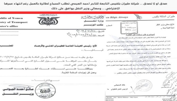 وبحسب الوثائق فقد تمنعت جهات مختصة في عدن عن تسجيل طائرة بلقيس المملوكة للعيسي عن اتخاذ اي اجراءات، بل سارعت الى اعطاءه صورة استثنائية تمكن طائرته من الهبوط والاقلاع دون شروط السلامة المتمثل بالعمر الافتراضي للطائرة المسموح لها بالاقلاع في الأجواء الوطنية”.