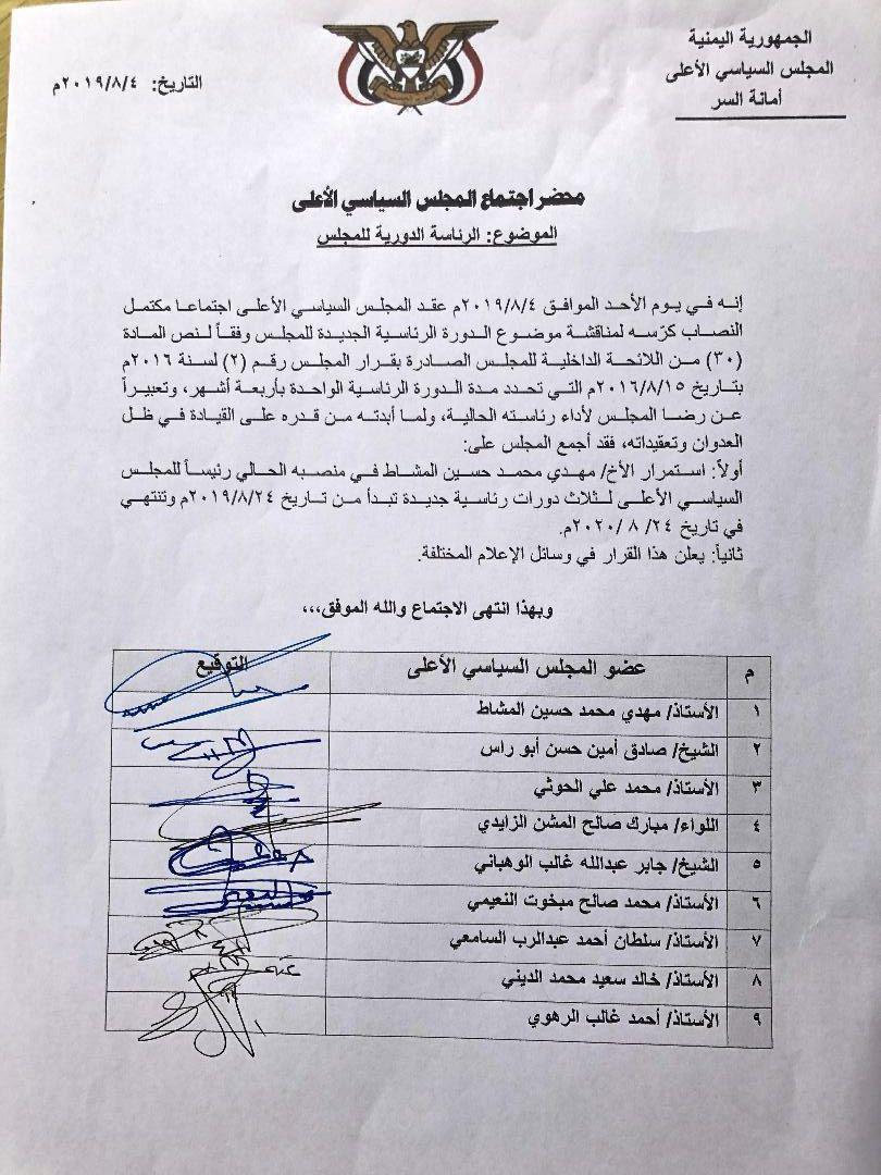كما أقر المجلس السياسي الأعلى أن تبدأ فترة التمديد من 24 أغسطس 2019م وتنتهي في 24 أغسطس 2020م لنجاح الرئيس مهدي المشاط خلال المرحلة الماضية ولما أبداه من قدرة في قيادة البلد.