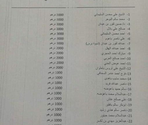 وتظهر الوثيقة أسماء لـ27 شخصية ابتدأت بالشيخ علي محسن السليماني وانتهت بـعوض محمد الجنيدي ممن يستلمون مبالغ شهرية من دويلة الإحتلال الإماراتي مقابل بيعهم للأرض والعرض.