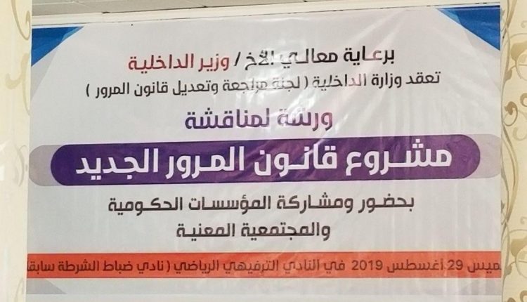 دشنت اليوم وزارة الداخلية ورشة عمل لمناقشة مشروع قانون المرور الجديد الذي اعدته لجنة من أساتذة القانون بأكاديمية الشرطة، وبمشاركة المؤسسات الحكومية والمجتمعية ذات العلاقة، وأخصائيين، وأكاديميين في القانون.