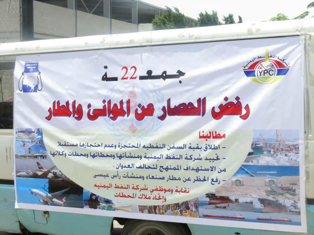 نظم موظفو شركة النفط اليمنية والنقابات والهيئات التابعة لها اليوم وقفة احتجاجية عقب صلاة الجمعة ال 21 امام مكتب الامم المتحدة بصنعاء بعنوان (رفض الحصار عن الموانئ والمطارات).