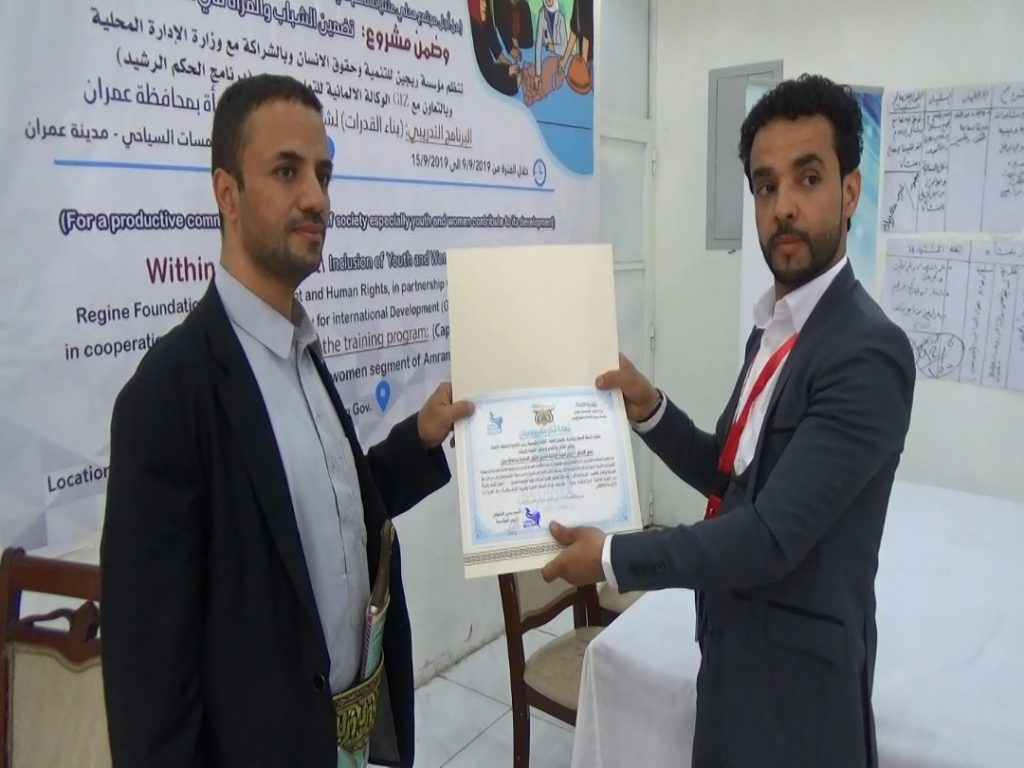 اختتمت في محافظة عمران اليوم، فعاليات البرنامج التدريبي الخاص ببناء قدرات الشباب والمرأة تنظمه مؤسسة ريجين للتنمية وحقوق الإنسان بالشراكة مع وزارة الإدارة المحلية وبالتعاون مع الوكالة الألمانية للتعاون الدولي برنامج الحكم الرشيد.
