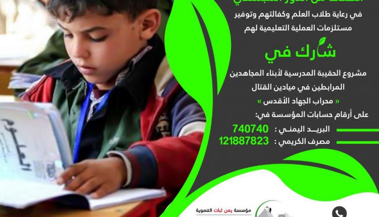 يمن ثبات تدعو للمشاركة في الحملة “الحقيبة والزي المدرسي” لأبناء المرابطين في جبهات العزة