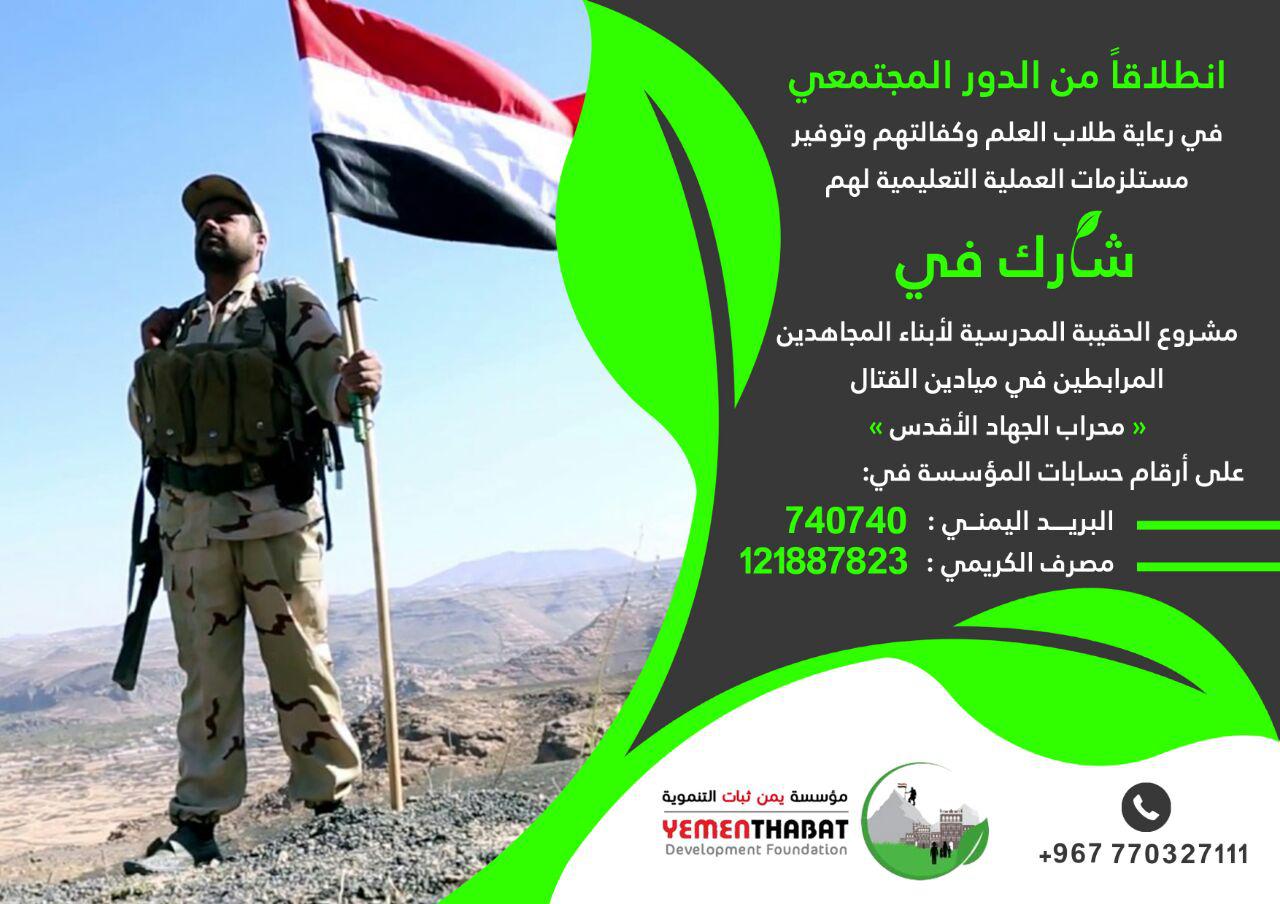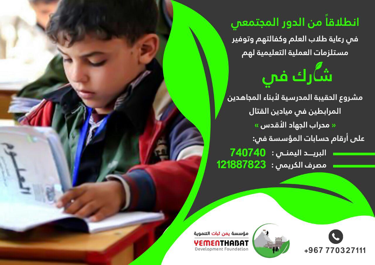 وتواصل حملة#حقيبة_مدرسية_لابناء_المرابطين استقبال جمع التبرعات التي يقدمها أبناء الشعب اليمني وأحرار العالم العربي والاسلامي وذلك عرفانا بالجميل لأهل التضحية والعطاء، من أبطال الجيش واللجان الشعبية، الذين يقارعون صلف التحالف الأمريكي السعودي ومسلحيه في مختلف الجبهات، صناعة جيل يتغلب على الصعوبات ويقهر المستحيل.
