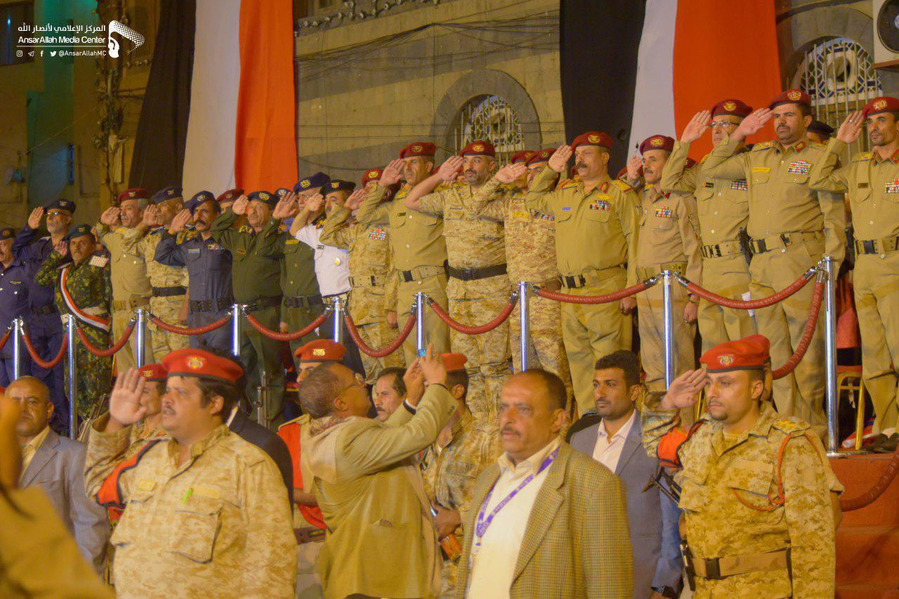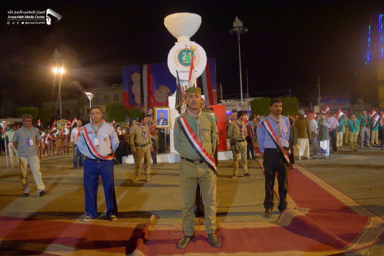 وفي الحفل الذي بدء بالسلام الوطني واستعراض حرس الشرف بحضور وزراء الشباب والرياضة والتربية والتعليم يحيى الحوثي والثقافة عبدالله الكبسي وأمين العاصمة حمود عٌباد والمفتش العام للقوات المسلحة اللواء الركن عبدالباري الشميري ومساعد وزير الدفاع اللواء علي الكحلاني، تم الاستئذان لدخول طابور الاستعراض لشباب الكشافة وزهرات المرشدات الذين قدموا عرضا شبابيا مصحوبا بالموسيقى العسكرية والألحان الوطنية.
