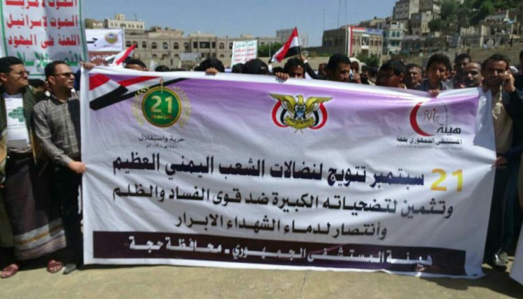أحيت محافظة حجة اليوم السبت الذكرى الخامسة لانطلاق شرارة ثورة 21سبتمبر تحت شعار حرية واستقلال بمسيرة وفعالية مركزية جماهيرية حاشدة بمركز المحافظة .