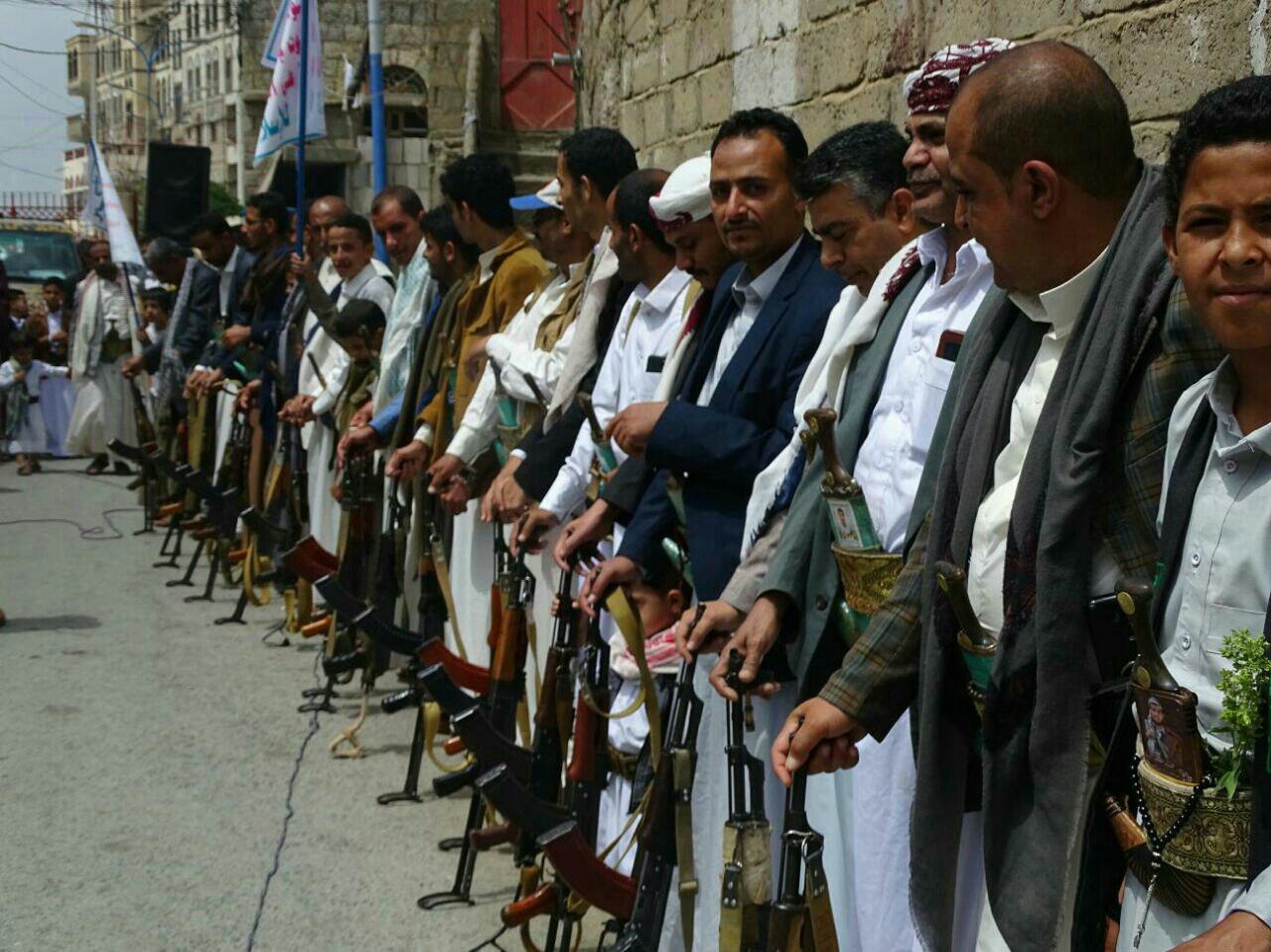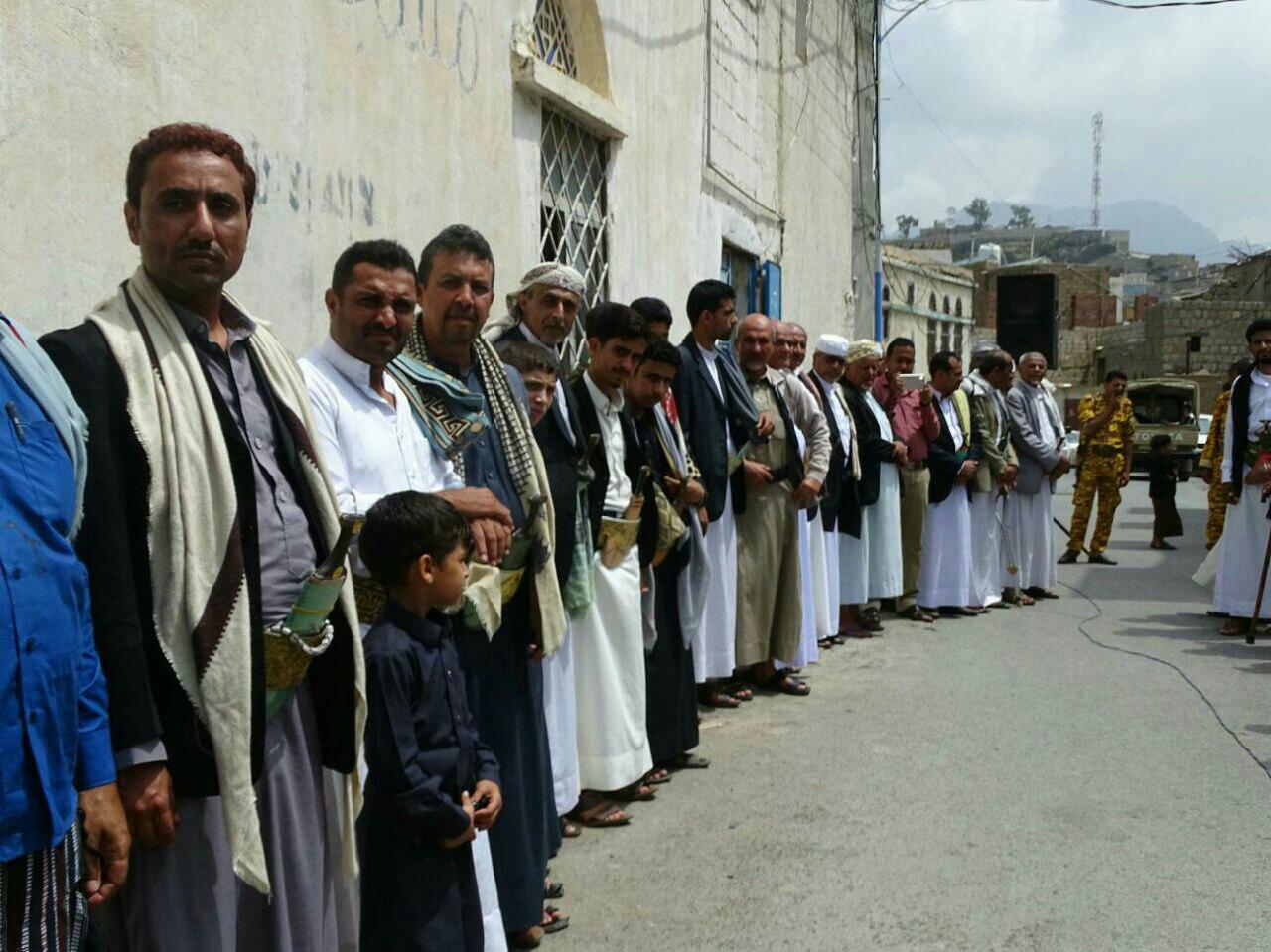 نظم أبناء ومشائخ وعقال ووجهاء مركز الضلعة والمعينة والمسيلة بمربع الظهرين بمدينة حجة اليوم عقب صلاة الجمعة وقفة احتجاجية مسلحة تنديدا واستنكار بجرائم وحصار وقصف العدوان الامريكي السعودي الغاشم على مدينة الدريهمي بمحافظة الحديدة وحجز جميع السفن الغذائية والصحية والنفطية من الدخول إلى بلادنا.