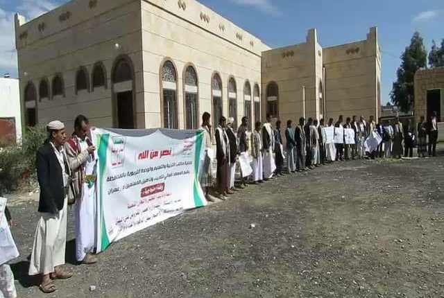 وفي محافظة عمران نظم موظفو المعهد العالي لتدريب وتأهيل المعلمين بمحافظة عمران اليوم وقفة احتجاجية للتنديد باستمرار العدوان والحصار ومنع دخول السفن النفطية.