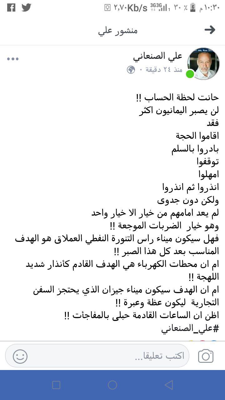 وأضاف الصنعاني في منشوره متسائلاً، “فهل سيكون ميناء راس التنورة النفطي العملاق هو الهدف المناسب بعد كل هذا الصبر!!”، مضيفاً، “ام ان محطات الكهرباء هي الهدف القادم كأنذار شديد اللهجة!!”.