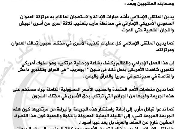 يدين الملتقى الإسلامي بأشد عبارات الإدانة والاستهجان لما قام به مرتزقة العدوان السعودي الأمريكي الإماراتي في محافظة مأرب بتعذيب ثلاثة أسرى من أسرى الجيش واللجان الشعبية حتى الموت.