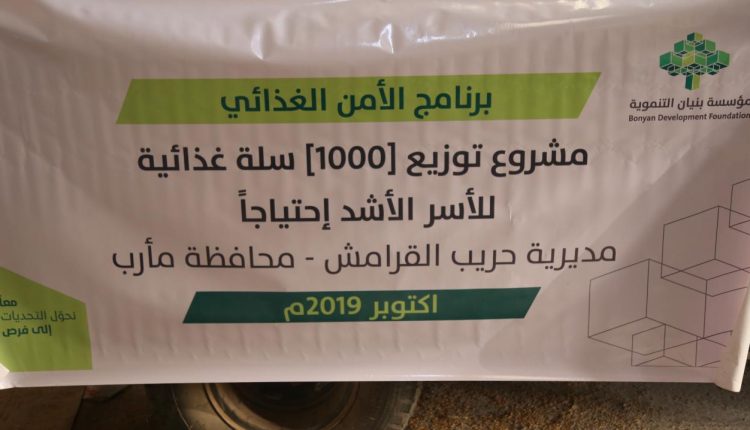 وزعت مؤسسة بنيان التنموية، اليوم، ألف سلة غذائية للأسر المحتاجة بمديرية حريب القراميش محافظة مأرب .