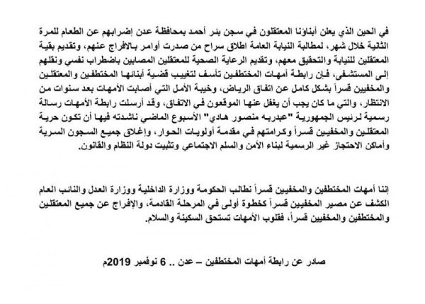 وقالت أمهات المختطفين في بيان لها، “في الوقت الذي يعلن أبناؤنا المعتقلون في سجن بئر أحمد بمحافظة عدن إضرابهم عن الطعام للمرة الثانية خلال شهر، لمطالبة النيابة العامة اطلاق سراح من صدرت أوامر بالافراج عنهم، وتقديم الرعاية الصحية للمعتقلين المصابين باضطراب نفسي ونقلهم إلى المستشفى، فإن رابطة أمهات المختطفين صدمت بالتوقيع على إتفاق الرياض دون الإشارة لقضية المختطفين والمخفيين قسريا في سجون الإمارات”.
