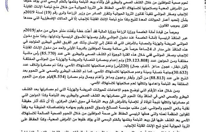 وبيًن أن الفرق الميدانية قامت خلال الفترة نفسها بالكشف البيطري لـ 85 ألف و770 من المواشي و29 مليون و132 ألف دجاجة، أتلف منها نحو 30 ألف و633 دجاجة لعدم صلاحيتها للاستهلاك.