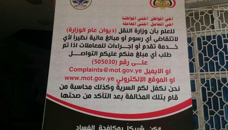 وفي التدشين أكد وزير النقل أهمية الوضوح والشفافية والتفاني في أداء المهام بما يخدم المجتمع .. مشيرا إلى أن تدشين العمل بإدارة خدمات الجمهور يأتي تنفيذا لتوجيهات رئيس المجلس السياسي الأعلى بشأن محاربة الفساد في كافة المؤسسات.