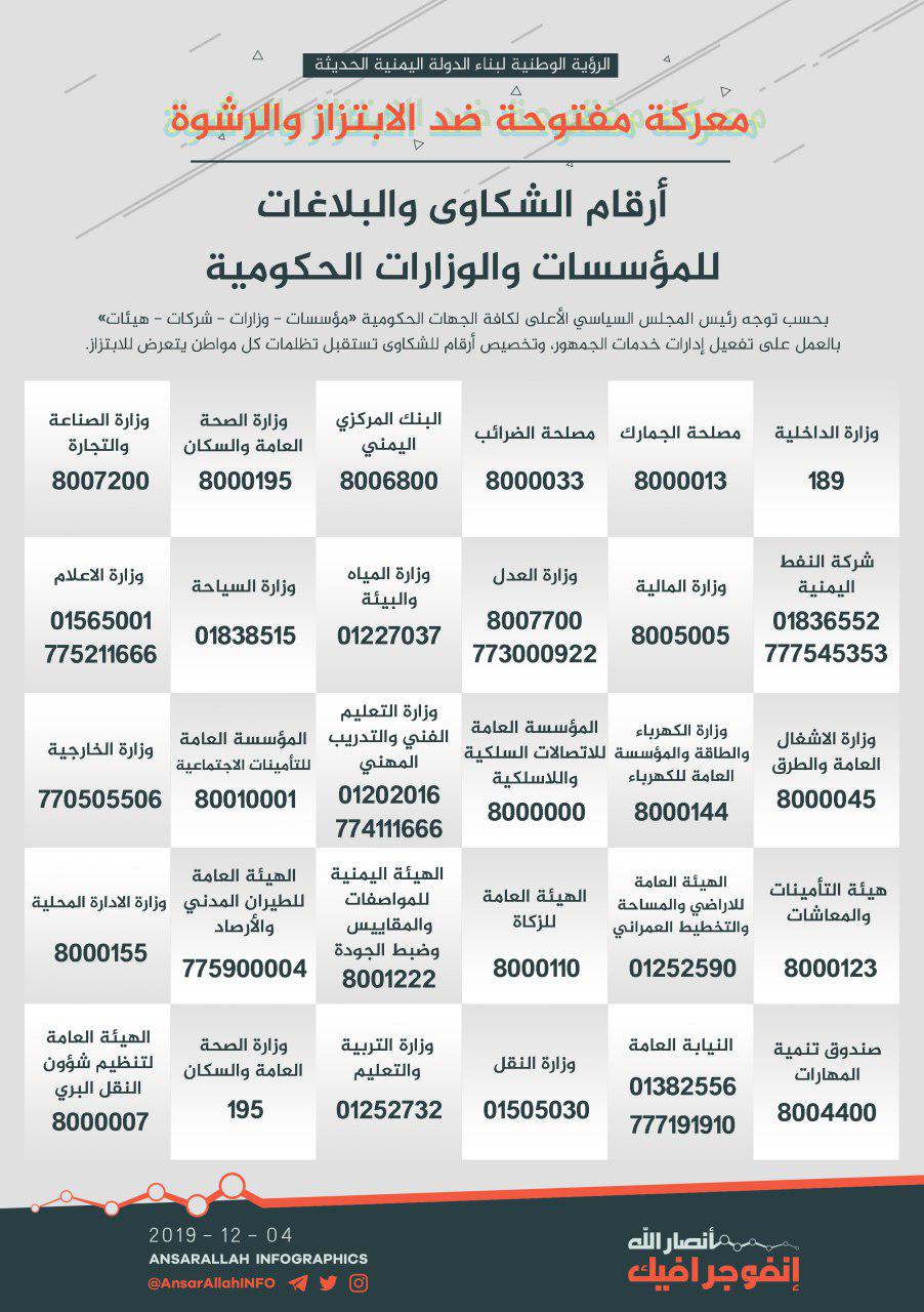 أخبار محليةاهم الاخبار تعرف على ارقام الشكاوي والبلاغات في المؤسسات والوزارات الحكومية يمانيون// أرقام الشكاوى والبلاغات للمؤسسات والوزارات الحكومية! #كن_شريكا_بمكافحة_الفساد Share