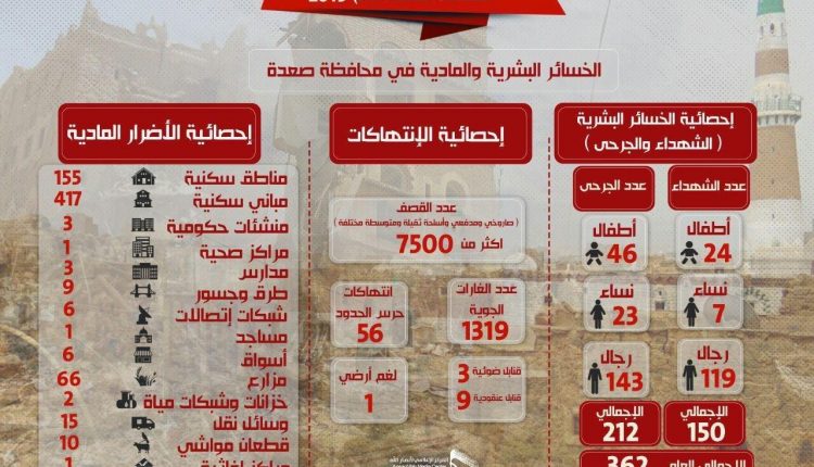 وتشير الاحصائيات إلى أن اجمالي عدد الغارات الجوية على محافظة صعدة بلغت أكثر من 1319 غارة جوية ، و9 قنابل عنقودية و 3 قنابل ضوئية ولغم أرضي واحد، فيما تجاوزت انتهاكات حرس الحدود السعودي 56 انتهاكا.