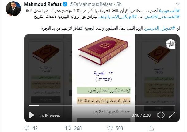 خبراء كشفوا عن مصحف مترجم لمعاني القرآن الكريم إلى اللغة العبرية صادر عن مجمع الملك فهد لطباعة المصحف الشريف بالمدينة المنورة، يحتوي على نحو 300 تحريف فادح، أبرزها ذكر عبارة “الهيكل” اليهودي بدلا من المسجد الأقصى، في ترجمة معاني سورة الإسراء، وعدم ذكر اسم النبي محمد صلى الله عليه واله وسلم ، والنبي عيسى، عليه السلام، وان النبي إبراهيم هو ابو إسحاق ويعقوب دون إسماعيل.