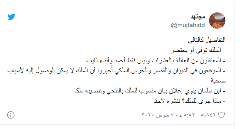 كشف المغرد السعودي الشهير “مجتهد” عن تطورات جديدة متعلقة بما حدث في السعودية بعد اعتقال عدد من الأمراء البارزين .