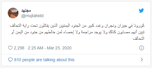 وأوضح “مجتهد” أنه لا توجد مراجعة أو إحصاء، لمن خالط هؤلاء من المرتزقة أو الجنود السعوديين.