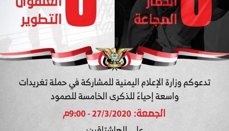 تطلق وزارة الإعلام الساعة التاسعة من مساء اليوم الجمعة، حملة تغريدات بمناسبة الذكرى الخامسة للصمود في وجهة العدوان.