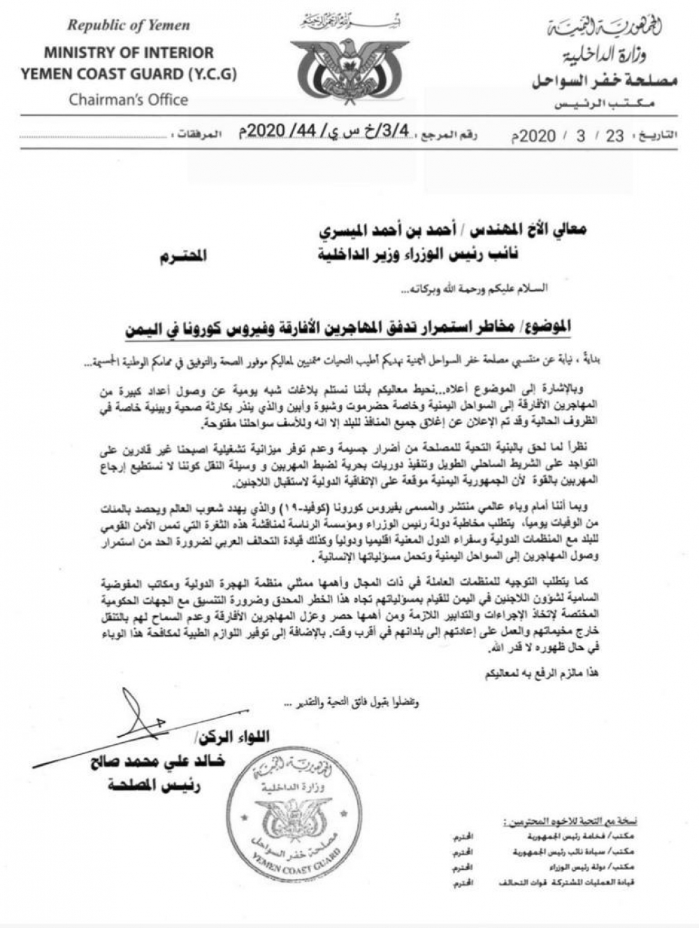 وكشفت الوثيقة التي وجهتها رئاسة مصلحة خفر السواحل، عن تلقيها بلاغات شبه يومية عن وصول أعداد كبيرة من المهاجرين الأفارقة عبر السواحل اليمنية وخاصة حضرموت وشبوة وأبين، والذي ينذر بكارثة صحية.