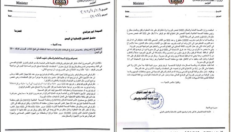 بالإشارة إلى الموضوع أعلاه نشكر لكم تعاونكم والوكالات التابعة للأمم المتحدة بالدعم المقدم لتعزيز القطاع الصحي في البلد وبخصوص تصريحكم بتاريخ 23 أبريل بعنوان ” المنظمات الإنسانية تسابق الزمن لمساعدة اليمن في مواجهة فيروس كوفيد -19 فإننا وبعد الاطلاع على التصريح نود أن نوضح التالي: