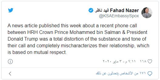 ونفى فهد ناظر، المتحدث باسم سفارة الرياض لدى الولايات المتحدة، صحة التقارير الإعلامية التي تحدثت عن هذه الواقعة مشيرا إلى أنها “حرفت فحوى ونبرة الاتصال”، على حد تعبيره.
