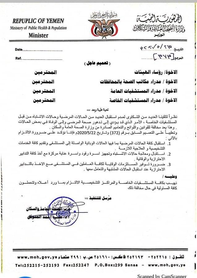 صنعاء.. تعميم هام من وزارة الصحة إلى جميع المستشفيات العامة والخاصة بشأن حالات الإشتباه بفيروس كورونا