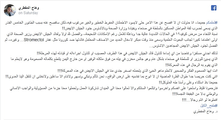 وقال المقطري في منشور له على صفحته بالفيسبوك: لعلمكم جميعا،، انا حاولت ان لا افصح عن هذا الامر حتى لا يسود الاطمئنان المفرط الخطير والغير مرغوب فيه،،لكن سأفصح عنه بسبب الطابور الخامس القذر الذي يسعى لضرب ثقة المواطن المسكين بالسلطة في صنعاء وبقيادة وزارة الصحة وبالأشاوس جنود الجيش الابيض!!