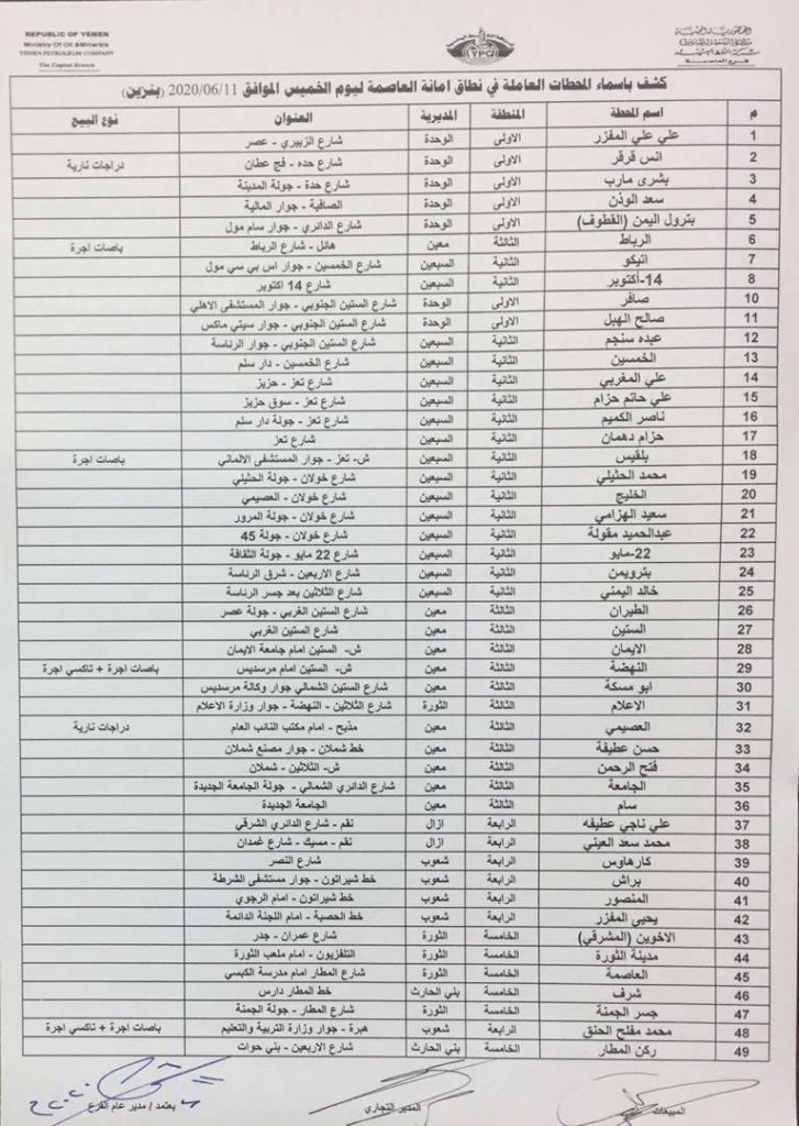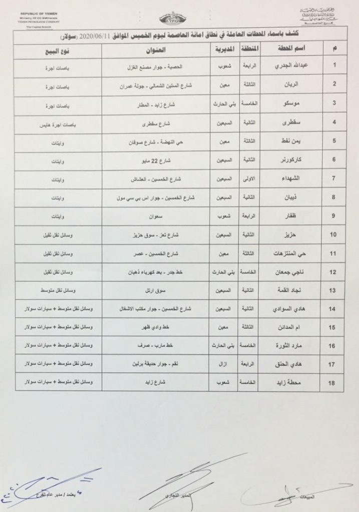 نشرت شركة النفط اليمنية كشوفات بـأسماء محطات تعبئة المشتقات النفطية العاملة بأمانة العاصمة صنعاء (بنزين + ديزل) اليوم الخميس الموافق 11 يونيو 2020م.
