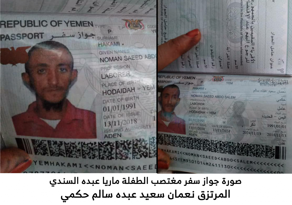 شاهد الوثائق والتقارير الطبية وكذلك صورة جواز سفر مغتصب الطفلة ماريا السندي المرتزق نعمان سعيد عبده سالم حكمي.