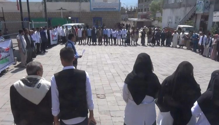 نظم العاملون والكوادر الطبية بهيئة مستشفى الثورة العام في محافظة إب اليوم وقفة احتجاجية رافضة للتطبيع الإماراتي مع الكيان الصهيوني.